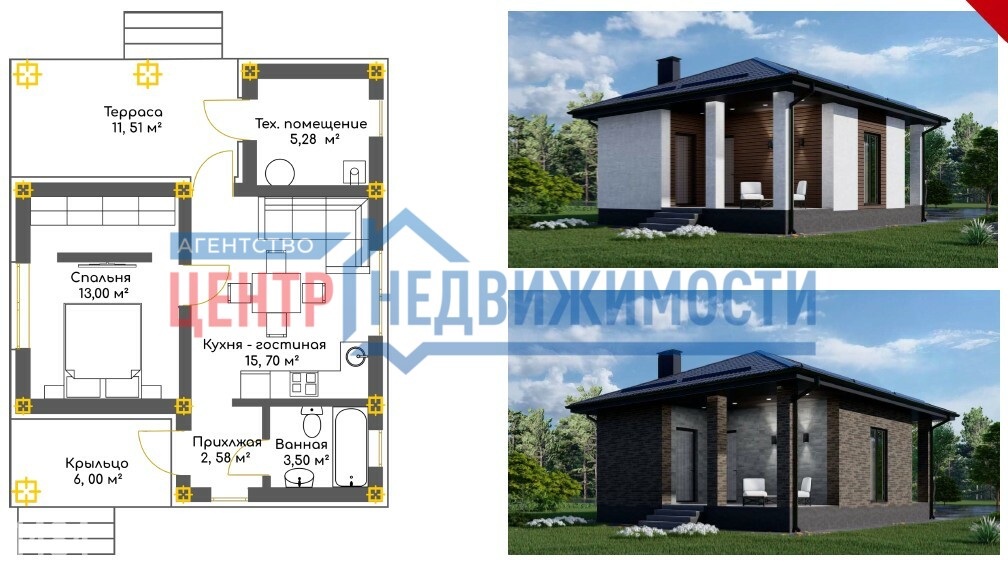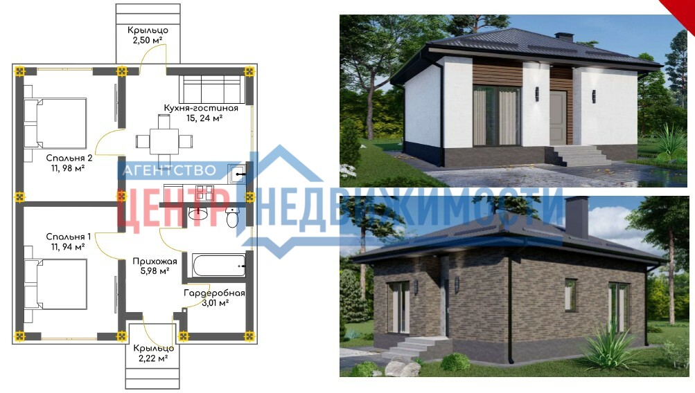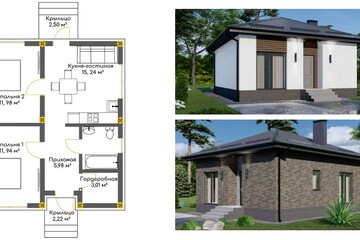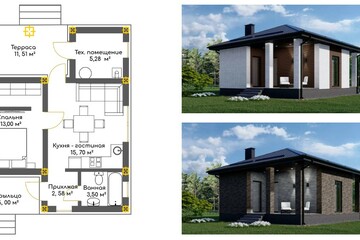- Современная продуманная планировка для комфортного проживания, дом состоит из коридора, кухни-гостиной, совмещённого санузла и 2-х спален;